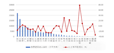 圖 8 2025 年上半年各地區(qū)建筑業(yè)企業(yè)房屋施工面積及其增長情況